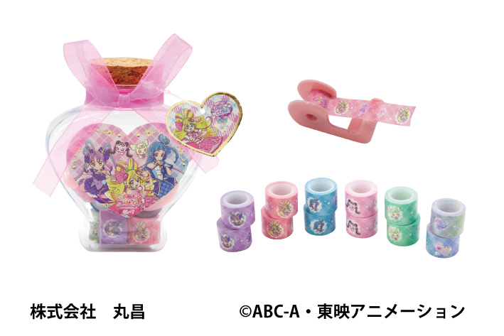 価格:税込 638円JAN:4950361 250056PKGサイズ:W115 × H160 × D45mm重さ:41gセット内容:本体1個、マスキングテープ(6柄×2)12個、専用テープカッター1個● ハート型のボトルにマスキングテープがいっぱい入っているよ!